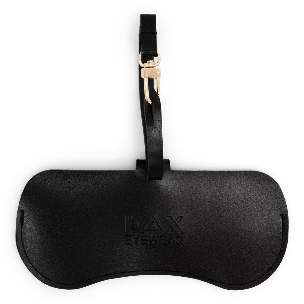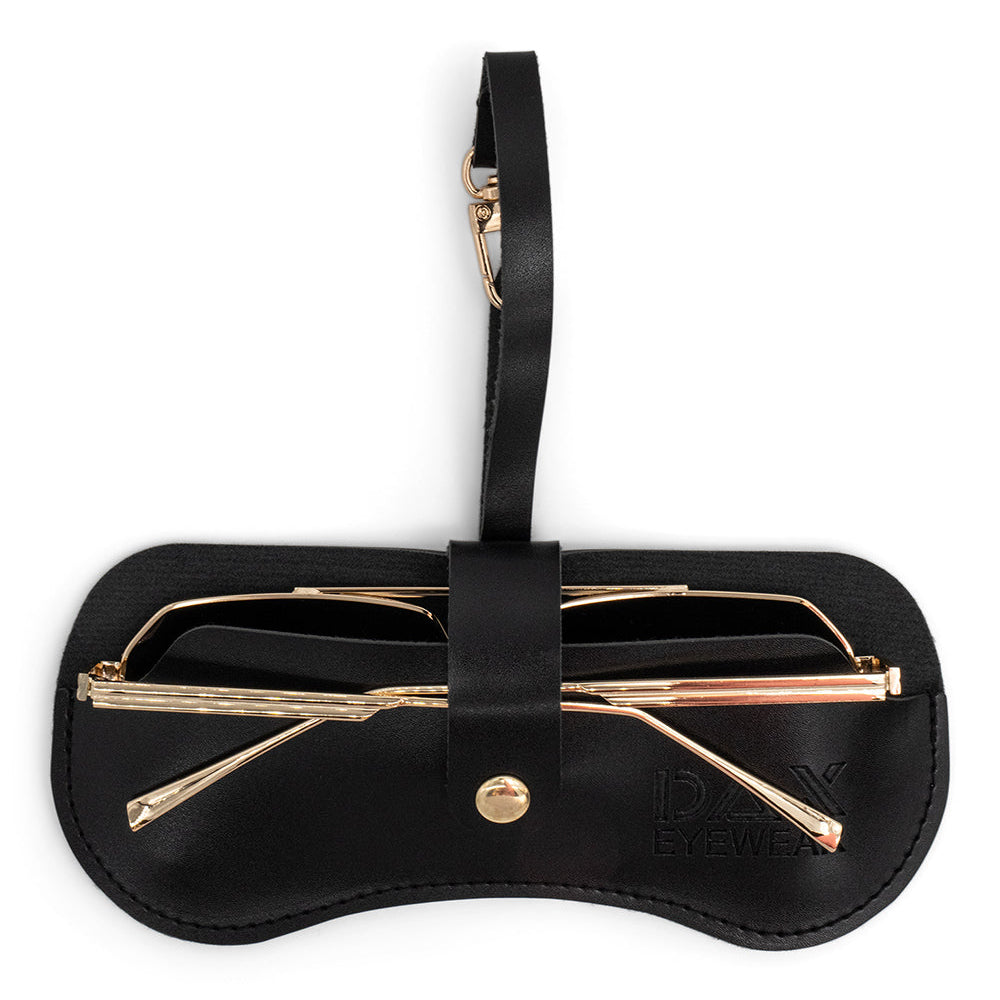 - Eyewear Clutch in Black - Elegant Black Clutch crafted from vegan leather, accented with gold-tone clip and snap hardware.