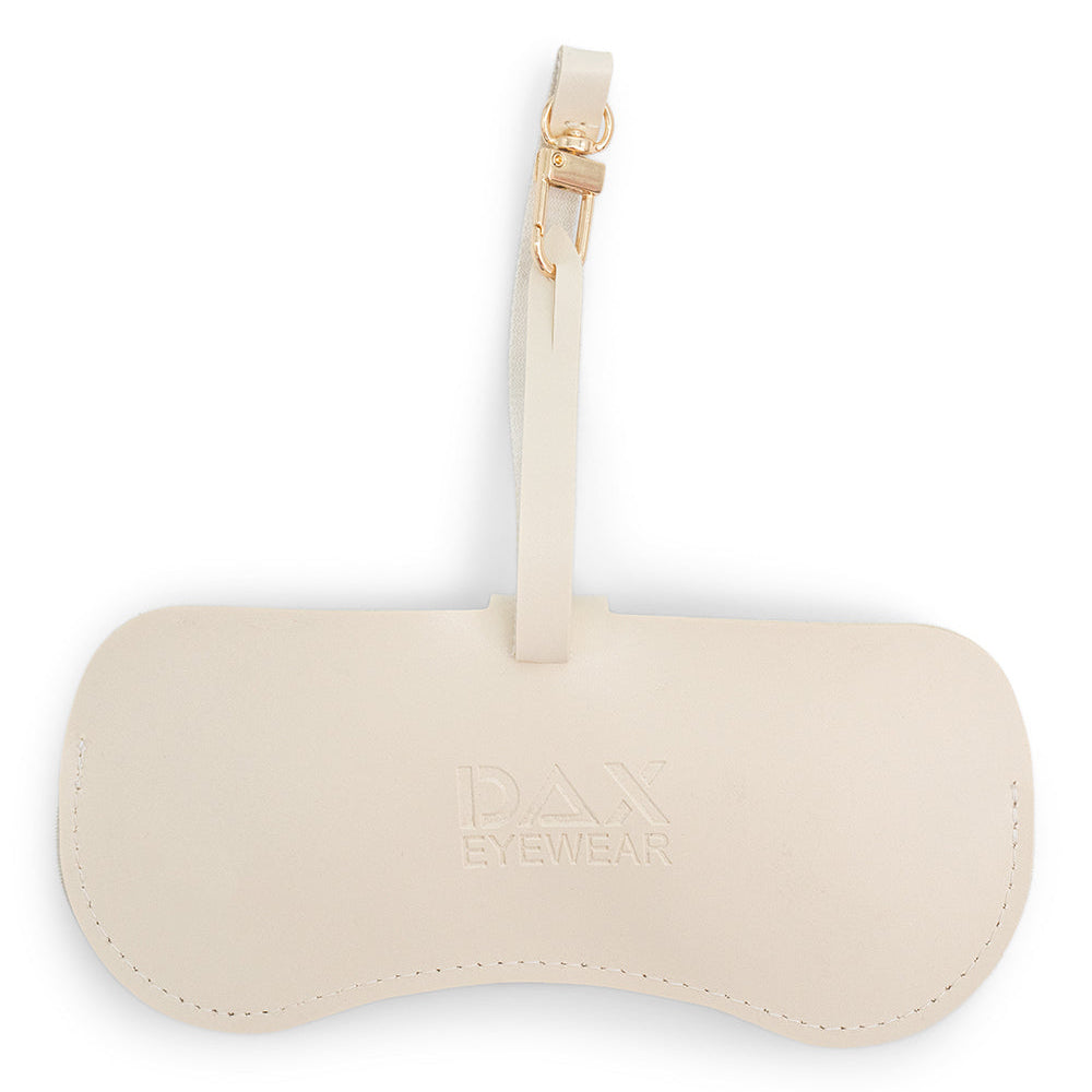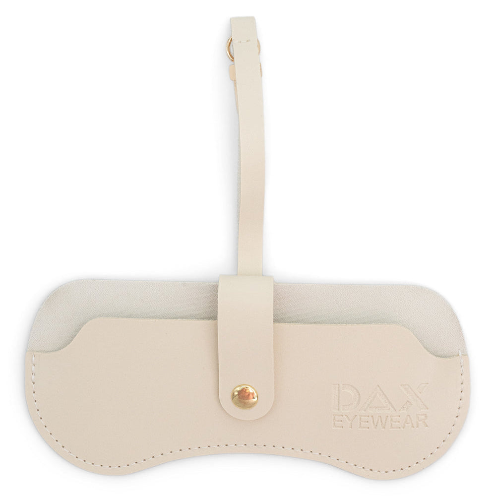 - Eyewear Clutch in Beige - Elegant Beige Clutch crafted from vegan leather, accented with gold-tone clip and snap hardware.